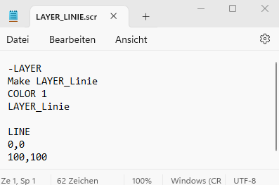 Ein Skript kann in einem Texteditor wie Notepad erstellt werden, und die Befehle, die normalerweise in die Befehlszeile eingegeben würden, werden darin geschrieben. Anschließend wird das Skript als Datei mit der Endung .SCR gespeichert. Ein Beispiel für ein Skript zum Erstellen eines neuen Layer und Zeichnen einer Linie könnte so aussehe: